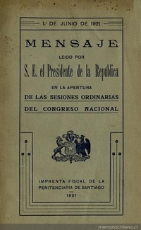 Mensaje leído por S.E. el Presidente de la República en la apertura de las sesiones ordinarias del Congreso Nacional. Santiago :[s.n.],1921-. v. ;25 cm.