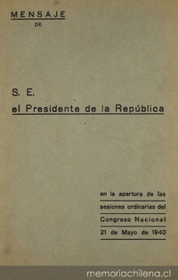 Mensaje de S.E. el Presidente de la República Don Juan Antonio Rios : en la apertura de las sesiones ordinarias del Congreso Nacional 21 de Mayo de 1944. [Santiago] :1944-. v. ;27 cm.