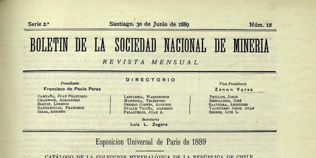 Boletín de la Sociedad Nacional de Minería. Santiago: La Sociedad, 1883-1918. 34 volúmenes, segunda serie, número 12, (30 junio 1889), páginas 309-323