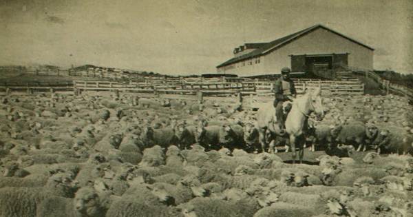 Piño de ovejas frente a un galpón de esquila, en una estancia de Magallanes, hacia 1940