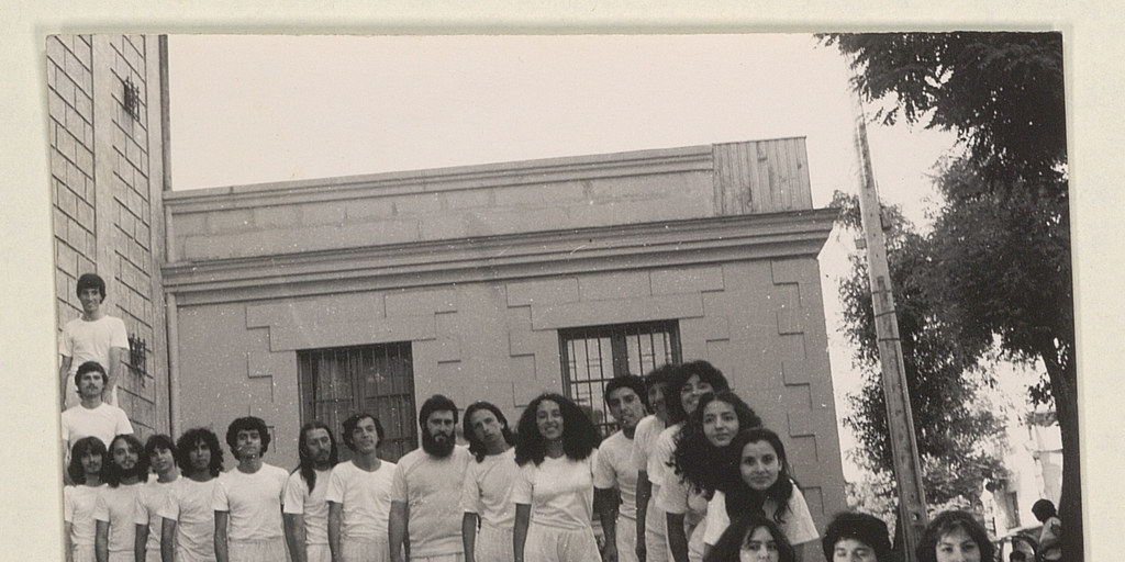 Elenco de Compañía Escuela Teatro Q en sesión fotográfica para montaje de A la diestra de Dios padre, 1985