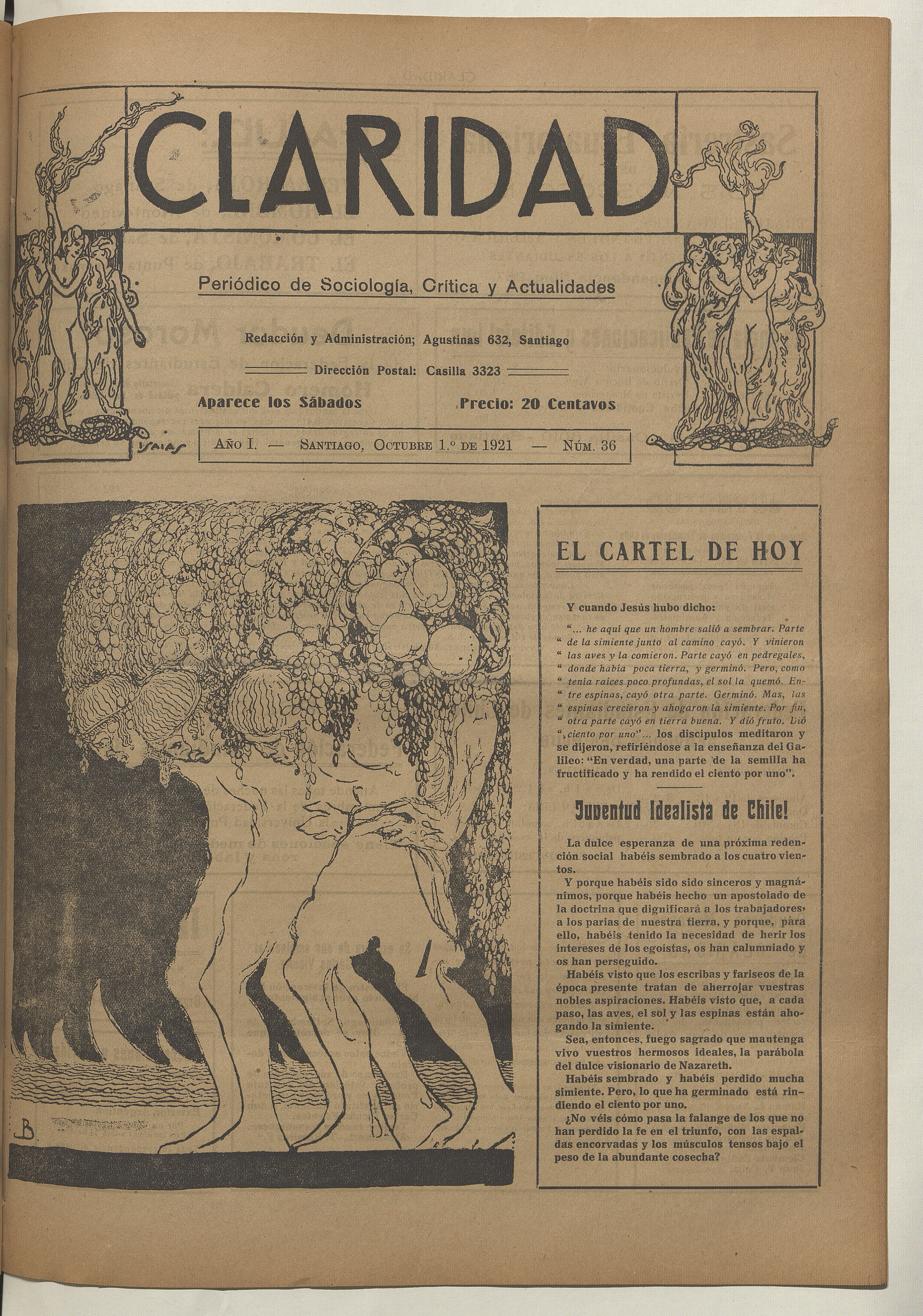 Claridad / Órgano oficial de la Federación de Estudiantes de Chile. Santiago : Fech, 1920-1959. (Santiago : Corporacion de Promoción Universitaria) volúmenes, año 1, número 36, (1 octubre 1921)
