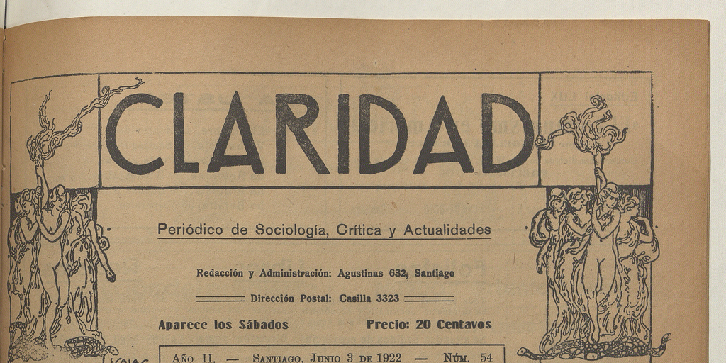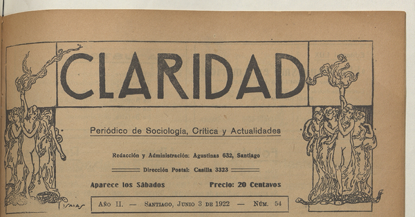 Claridad / Órgano oficial de la Federación de Estudiantes de Chile. Santiago : Fech, 1920-1959. (Santiago : Corporacion de Promoción Universitaria) volúmenes, año 2, número 55, (3 junio 1922)