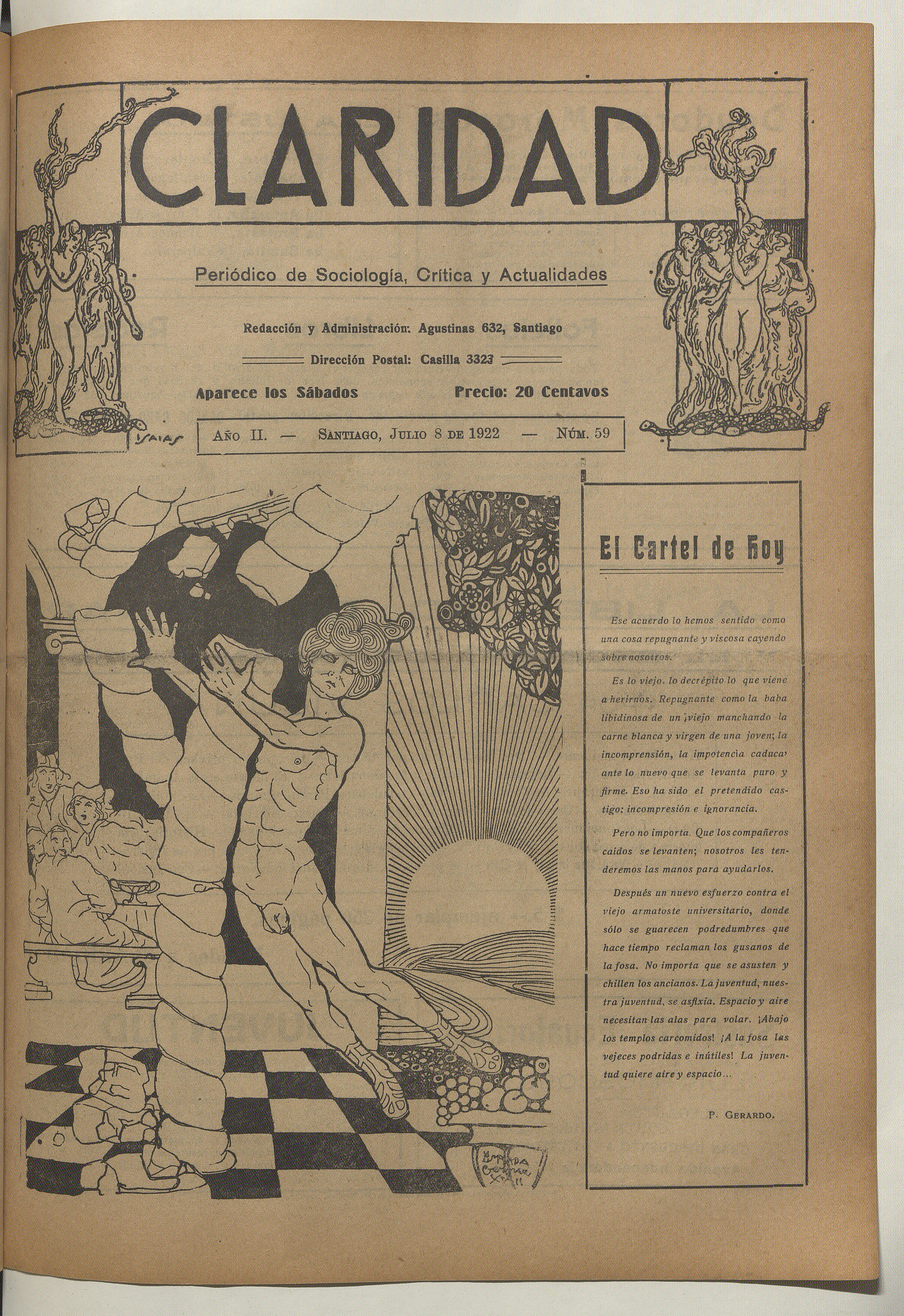 Claridad / Órgano oficial de la Federación de Estudiantes de Chile. Santiago : Fech, 1920-1959. (Santiago : Corporacion de Promoción Universitaria) volúmenes, año 2, número 59, (8 julio 1922)