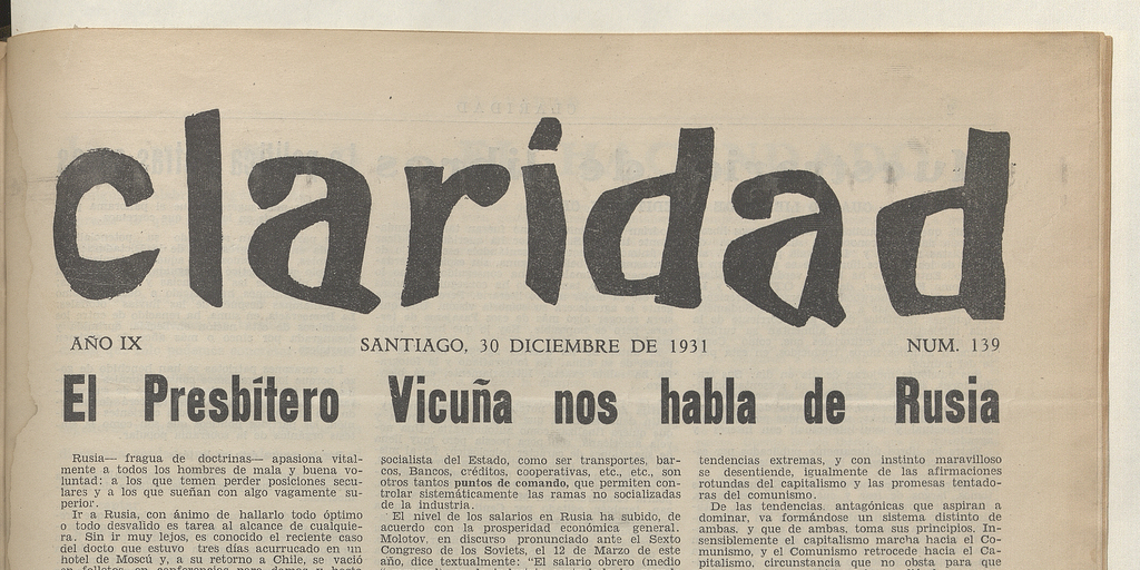 Claridad / Órgano oficial de la Federación de Estudiantes de Chile. Santiago : Fech, 1920-1959. (Santiago : Corporacion de Promoción Universitaria) volúmenes, año 9, número 139, (30 diciembre 1931)