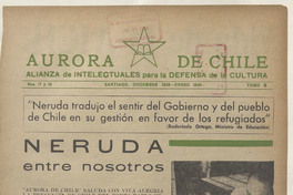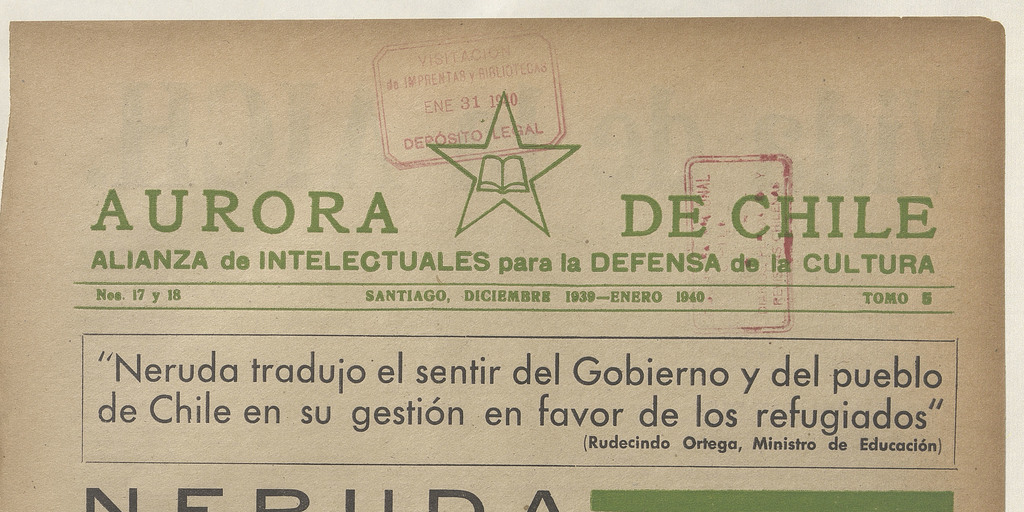 Aurora de Chile / Alianza de Intelectuales para la Defensa de la Cultura. [Santiago] : La Alianza, 1938-1940. 3 volúmenes, tomo 5, números 17-18, (diciembre 1939-enero 1940)