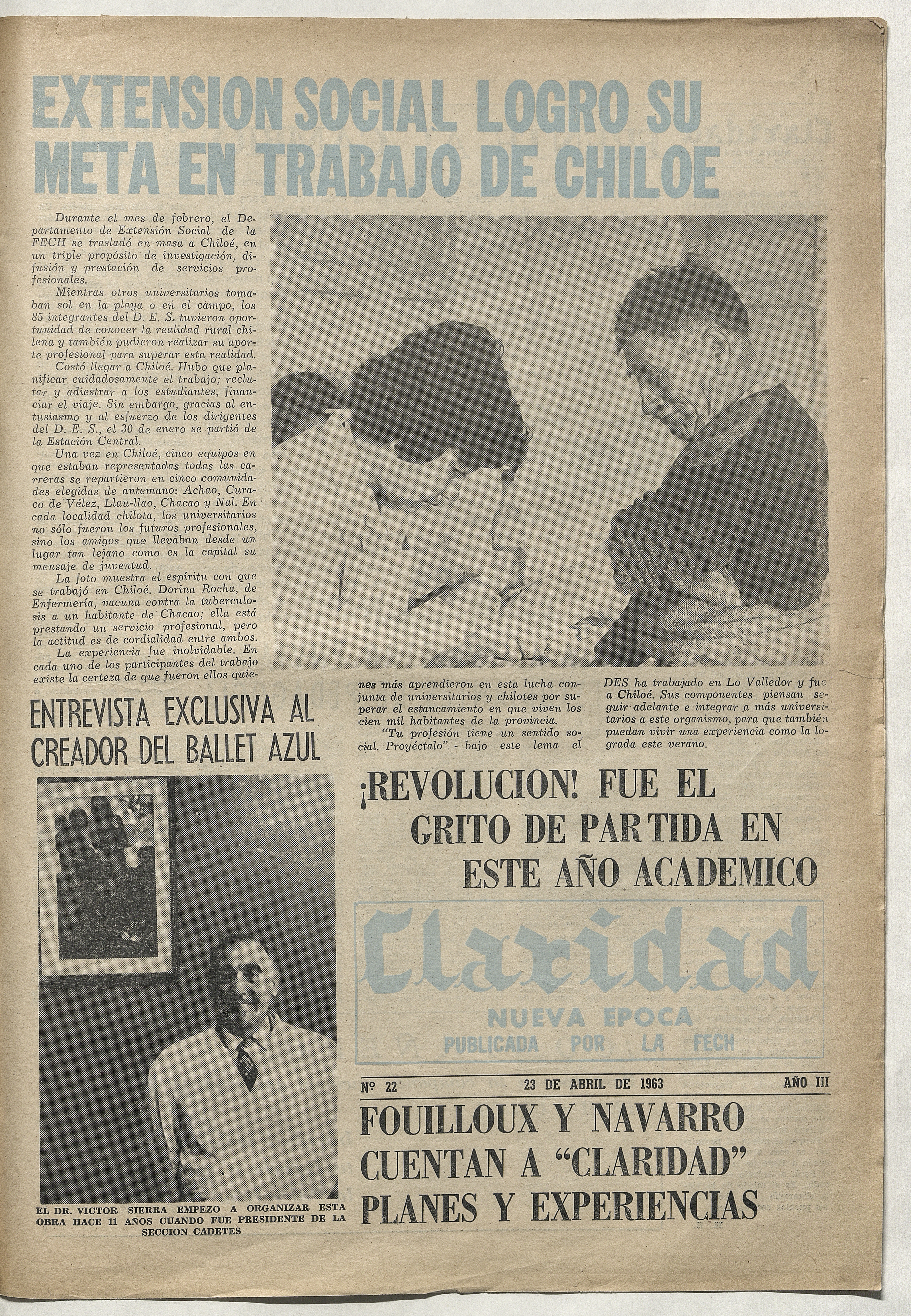Claridad / Órgano oficial de la Federación de Estudiantes de Chile. Santiago : Fech, 1920-1959. (Santiago : Corporacion de Promoción Universitaria) volúmenes, año 3, número 22, (23 abril 1963)