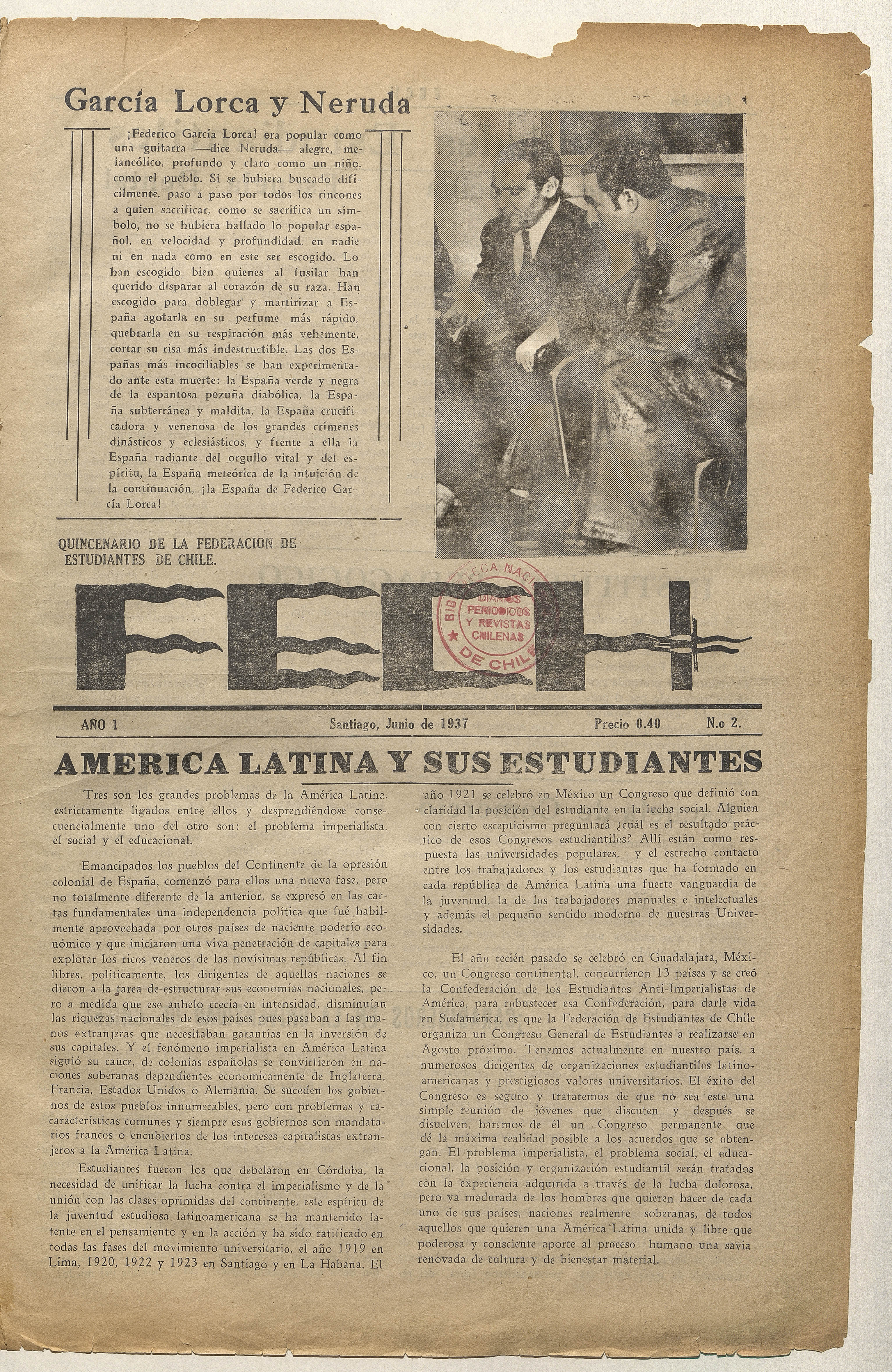 FECH / órgano oficial de la Federación de Estudiantes de Chile. Santiago : La Federación, 1937 (Santiago : Impr. Condor) 8 números, año 1, número 2, (junio 1937)