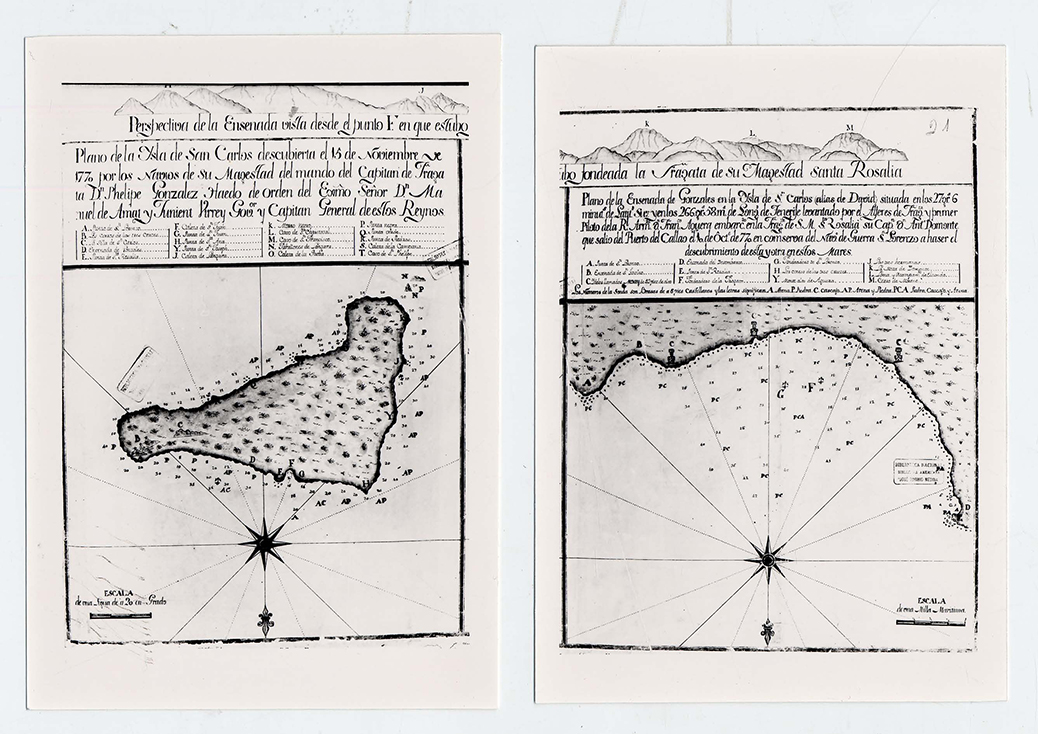 Perspectiva de la Ensenada vista desde el punto F en que estuvo fondeada la Fragata de su Majestad Santa Rosalia: Plano de la Isla de San Carlos, descubierta el 15 de noviembre 1770, por los navíos de S.M. al mando del capitán de fragata Don Felipe Gonzáles de Aedo ... y Plano de la Ensenada de Gonzáles en la Isla de S. Carlos alias de David...