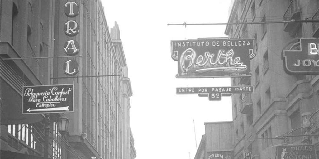 Calle Huérfanos, con sus avisos luminosos de casas comerciales, como la Marquesina Cine Central, Café Santos, Peluquería Confort para Caballeros, Instituto de Belleza Berthe, etc. y autos estacionados en ambos costados