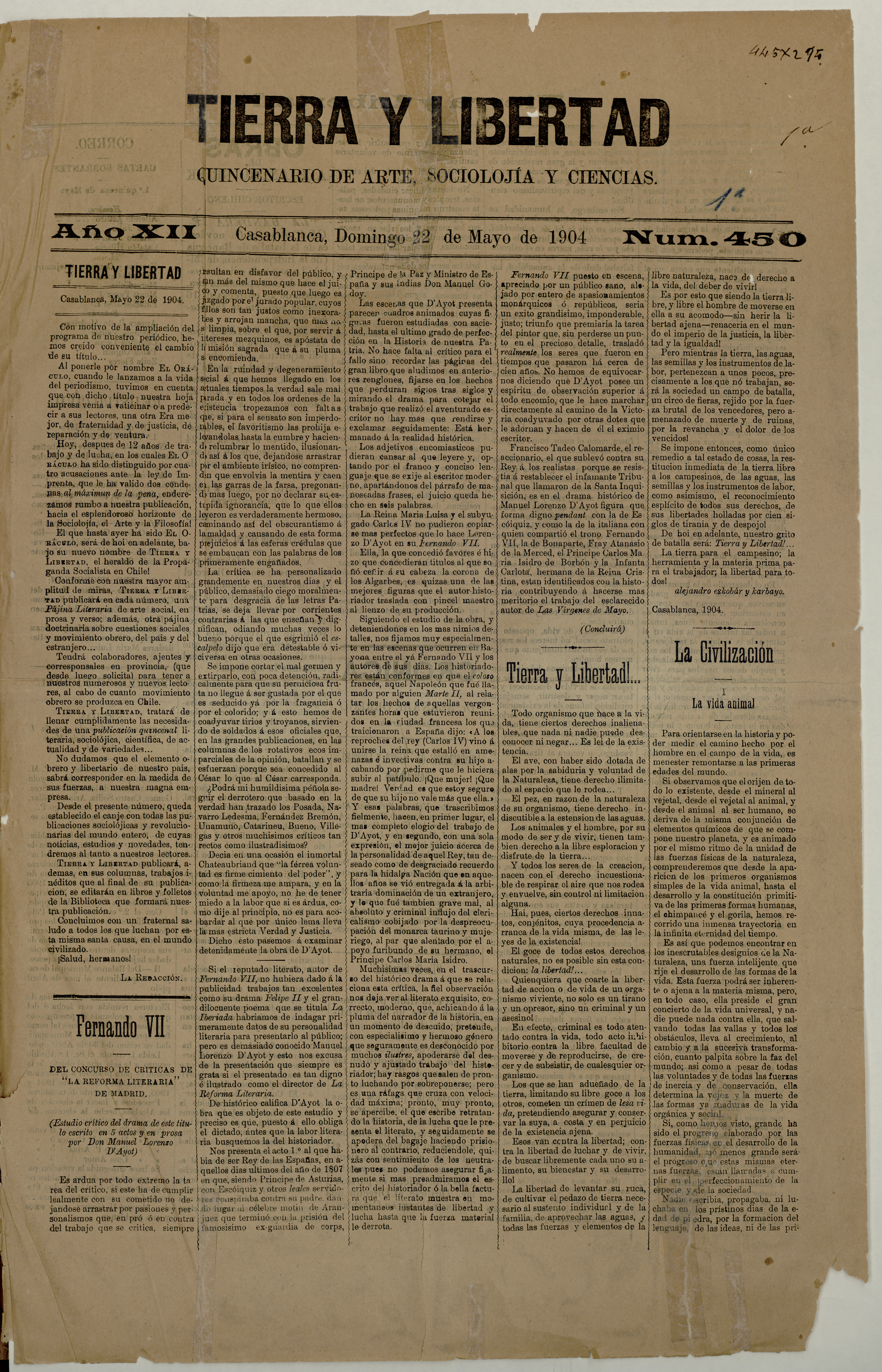 Tierra y libertad. Casablanca : Impr. El Oráculo, 1904-1906. 511 números, año 14, número 496, (primera quincena abril 1906)