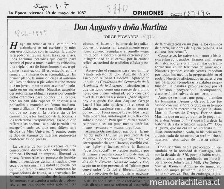 La Época. Santiago : Impresiones y Comunicaciones, 1987-1998 (Santiago : Impasa) 273 volúmenes, (29 mayo 1987), página 7