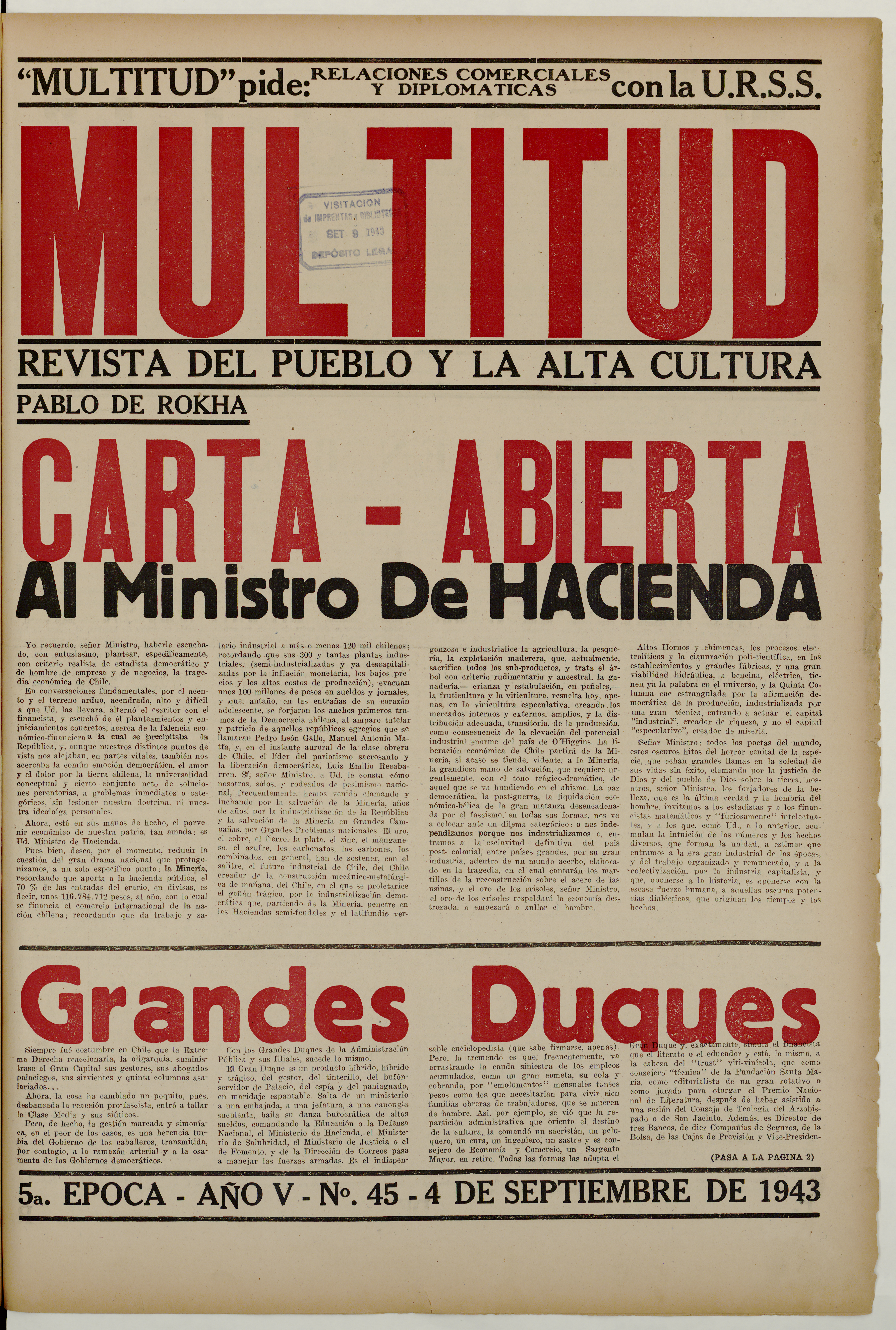 Multitud. Santiago : [Editor no identificado], 1939-1963. 22 volúmenes, año 5 , número 45, (4 septiembre 1943)