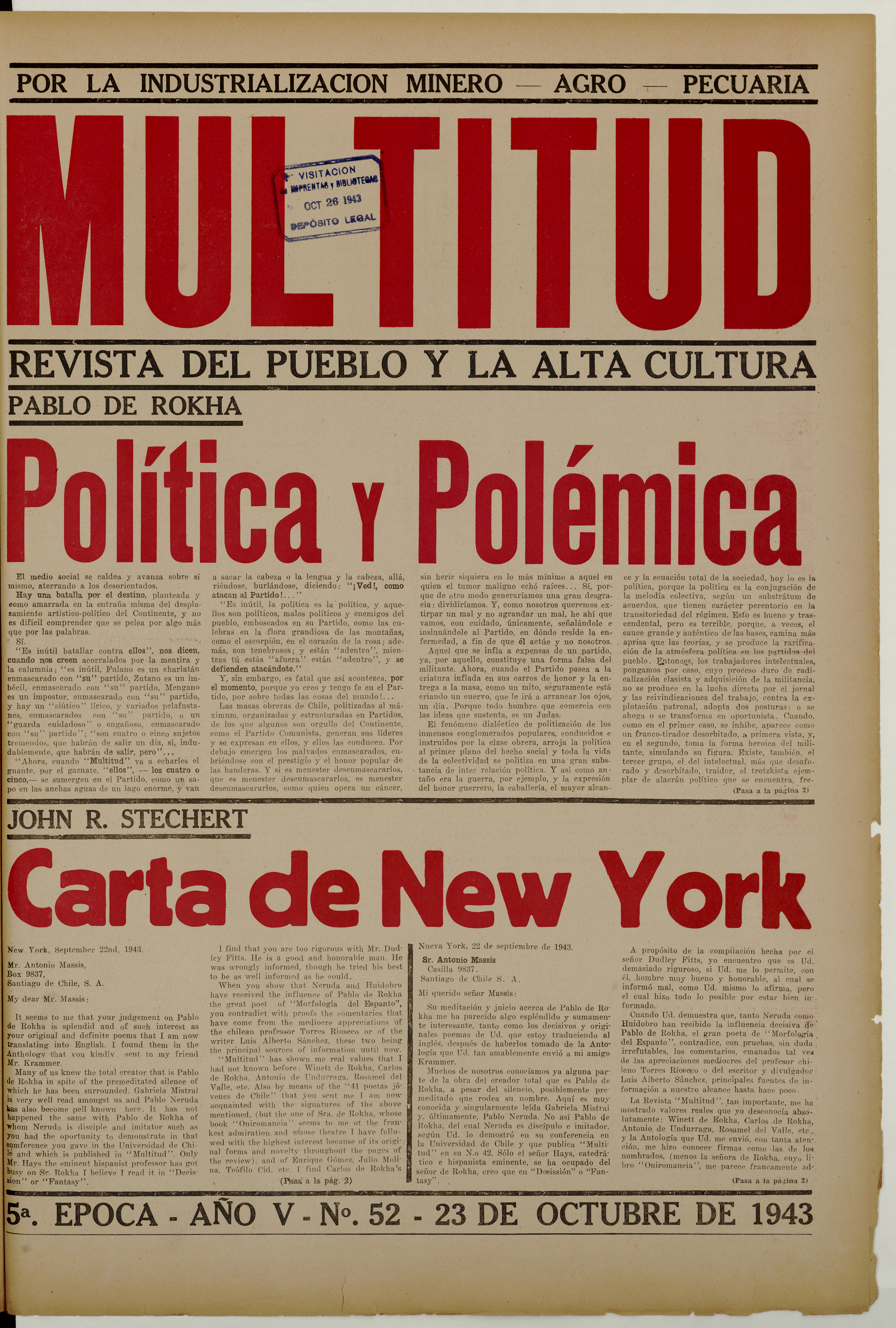 Multitud. Santiago : [Editor no identificado], 1939-1963. 22 volúmenes, año 5, número 52, (23 octubre 1943)