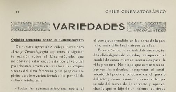 Chile cinematográfico. Santiago : [Editor no identificado.], 1915-1916. 2 volúmenes, año 1, n° 1, (25 junio 1915), página 11