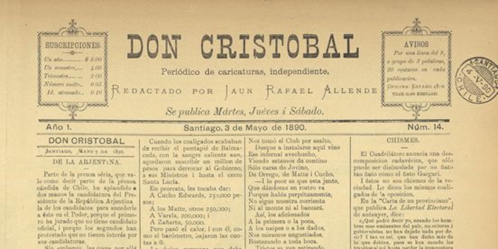 Don Cristóbal / redactado por Juan Rafael Allende. Santiago : Imprenta Estado, 1890. 80 números, año 1, número 14, (3 mayo 1890)