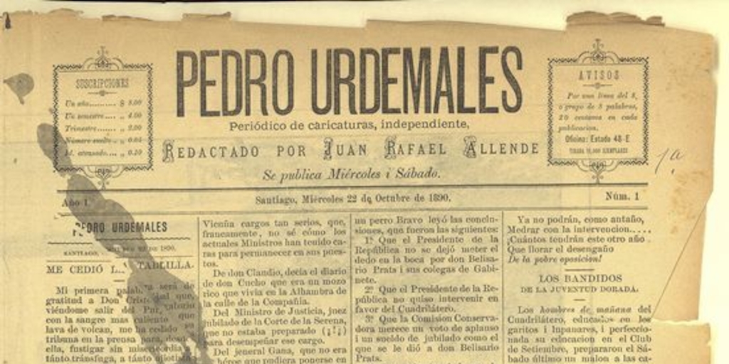 Pedro Urdemales. Santiago : Imprenta de Pedro Urdemales, 1890-1891. 43 números, año 1, número 1, (22 octubre 1890)