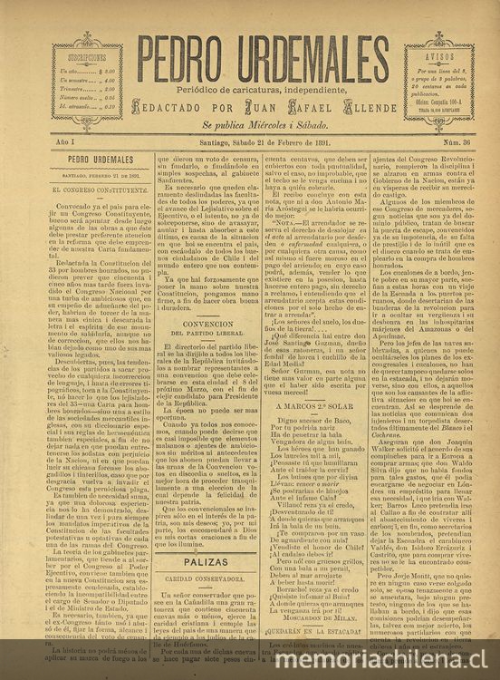 Pedro Urdemales. Santiago : Imprenta de Pedro Urdemales, 1890-1891. 43 números, año 1, número 36, (21 febrero 1891)