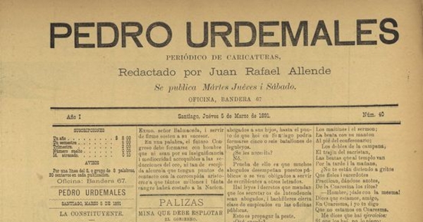 Pedro Urdemales. Santiago : Imprenta de Pedro Urdemales, 1890-1891. 43 números, año 1, número 40, (5 marzo 1891)