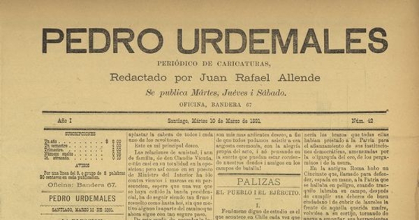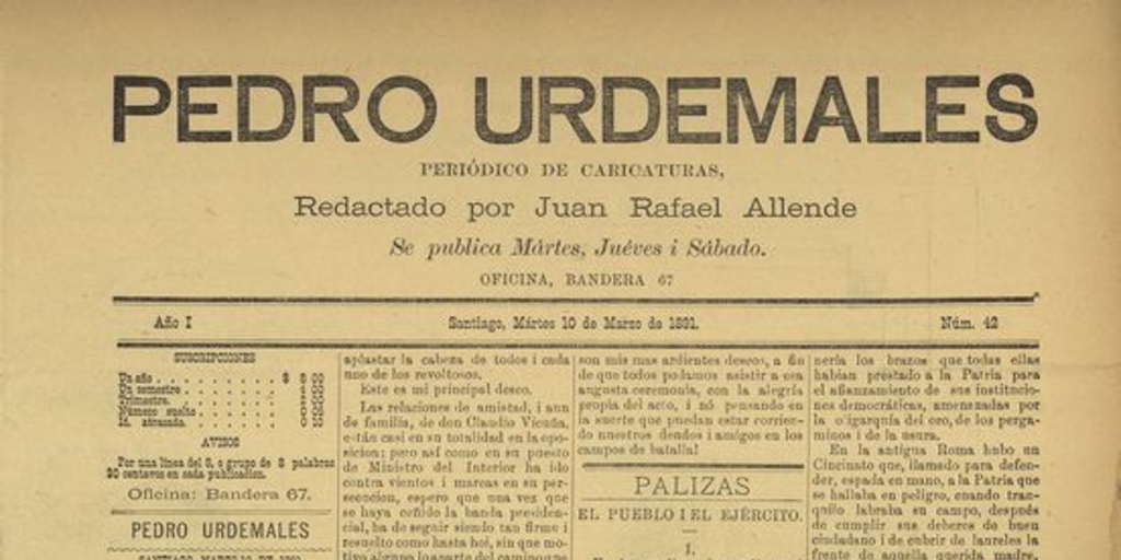 Pedro Urdemales. Santiago : Imprenta de Pedro Urdemales, 1890-1891. 43 números, año 1, número 42, (10 marzo 1891)