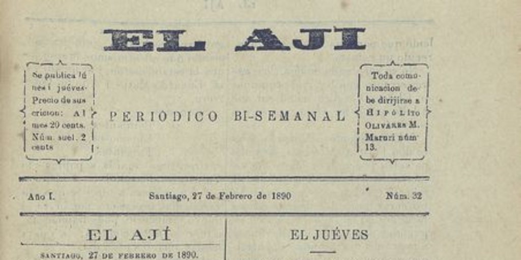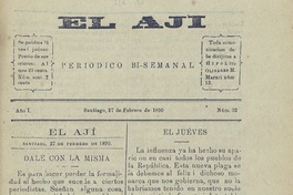 El Ají. Santiago : Imprenta de La Igualdad, 1889-1896. 6 tomos, año 1, número 32, (27 febrero 1890)