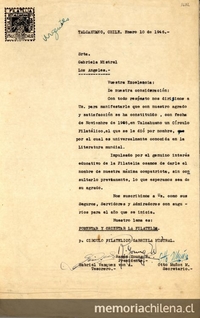 Carta del Círculo de Filatelia Gabriela Mistral a la poetisa para que le otorgue permiso para usar su nombre