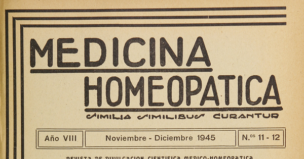 Medicina homeopática. Santiago : [Editor no identificado] , [1938]-1946. 2 volúmenes, año 8, números 11-12, (noviembre-diciembre 1945)