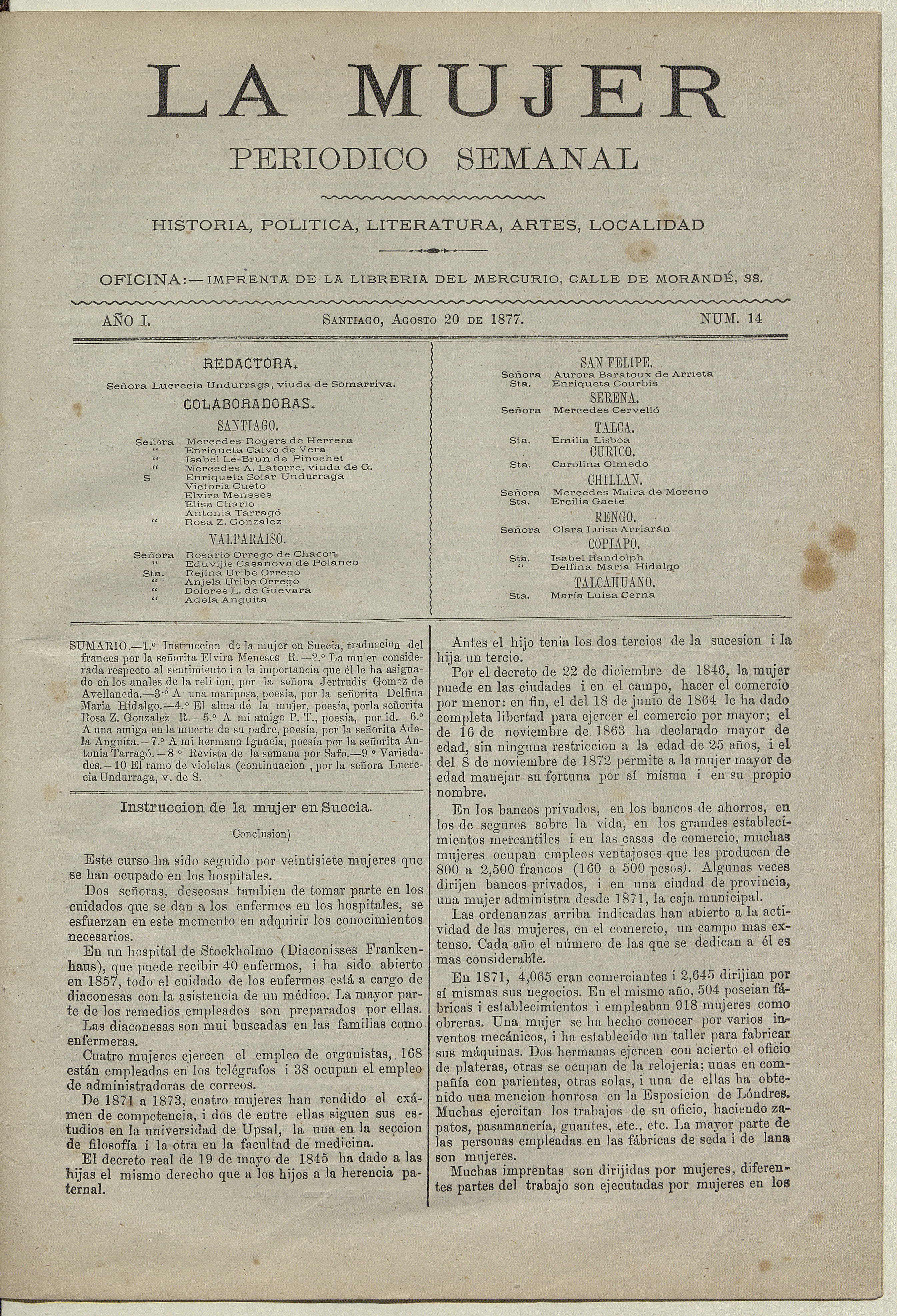 La Mujer. Santiago : redactado por Lucrecia Undurraga, viuda de Somarriva, 1877, (Santiago : Imprenta de la Libreria del Mercurio), 1 volumen, año 1, número 14, (20 agosto 1877)