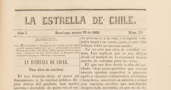 La Estrella de Chile. Santiago : Imprenta Chilena, 1867-1879. 12 volúmenes, tomo 1, año I, número 25 (22 marzo 1868), página 290-293
