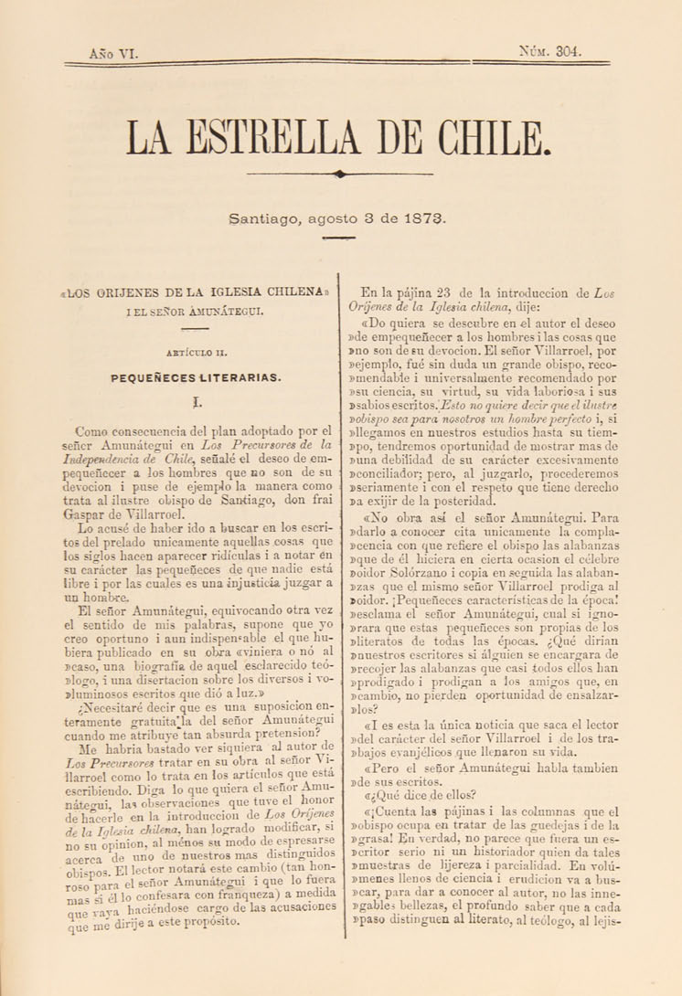 La Estrella de Chile. Santiago : Imprenta Chilena, 1867-1879. 12 volúmenes, año 6, números 304-305, 307-309, (3 agosto-7 septiembre 1873)