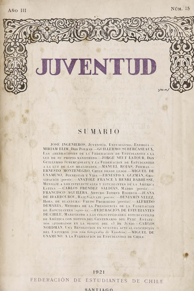 Juventud / Federación de Estudiantes de Chile. Santiago : La Federación, 1918-1951 (Santiago : Imprenta España) 3 volúmenes, año 3, número 15, (1921), páginas 336-340