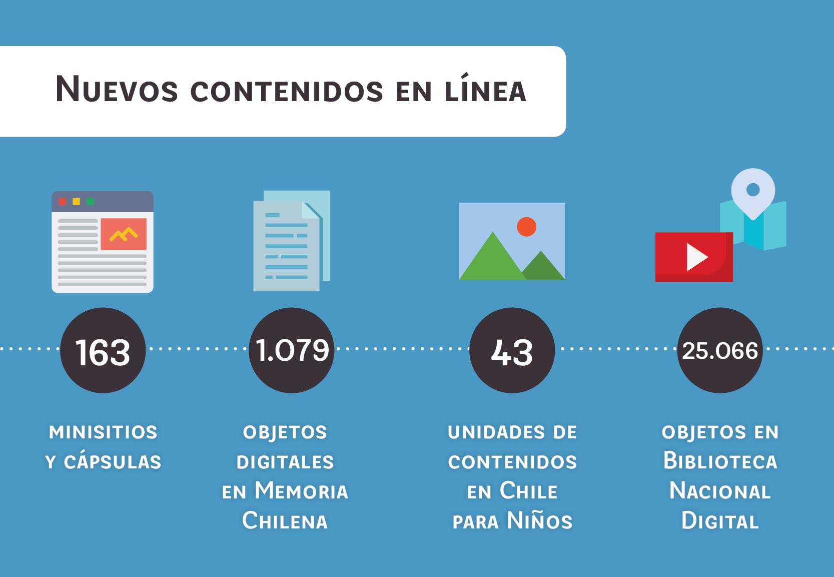 Durante el año, los investigadores de Memoria Chilena trabajaron en 87 nuevas cápsulas y once nuevos minisitios, entre los que se cuentan algunos ya publicados, como Fanor Velasco Salamó (1843-1907), Sociedad de la Igualdad (1850-1851), Traducción en Chile (1812-1924), La fotografía en Chile (1840-1911), Rosario Orrego (1831-1879). Otros son de pronta publicación, como Cerro Santa Lucía (1500-1910), Testimonios sobre la Cordillera de los Andes, Ortografía en Chile (1823-1927), Zorobabel Rodríguez (1839-1901), Las primeras revistas deportivas (1889-1948), Habitaciones obreras y viviendas sociales, agua potable en Chile, Inés Echeverría de Larraín (Iris) (1868-1949) y María Graham (1785-1842). Otras 6 cápsulas fueron editadas para actualizar su información. Nuestras catalogadoras, en tanto, ingresaron 1219 nuevos registros y corrigieron otros 1400 con más y mejor información.