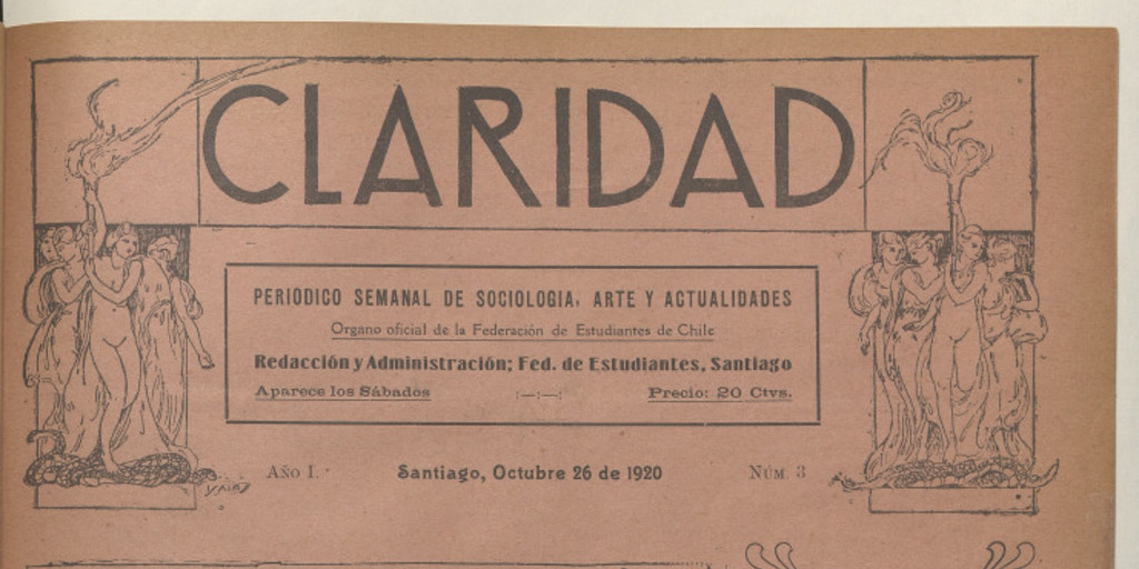 Claridad / Órgano oficial de la Federación de Estudiantes de Chile. Santiago : Fech, 1920-1959. (Santiago : Corporación de Promoción Universitaria), volúmenes, año 1, número 3, (26 octubre 1920)