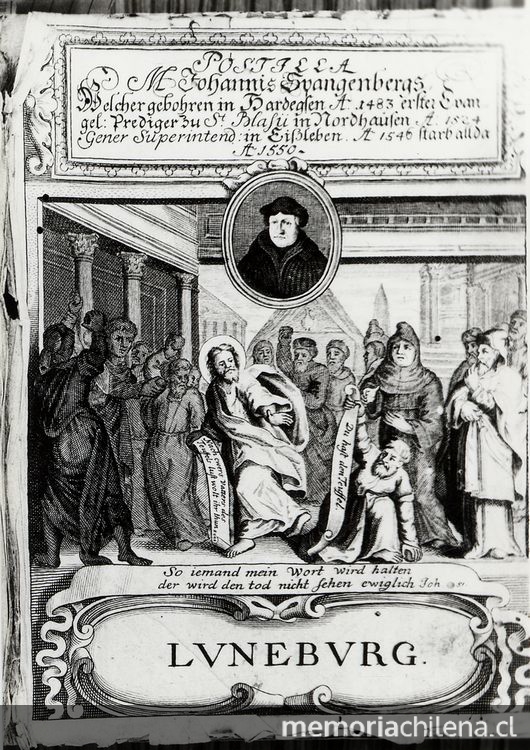 Portada y frontispicio de postilla explicación de los evangelios y de las epístolas, 1718