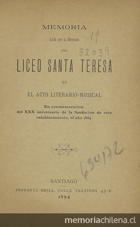 Memoria leída por la directora del Liceo de Santa Teresa en el acto literario musical en conmemoración del XXX aniversario de la fundación de este establecimiento el año 1864