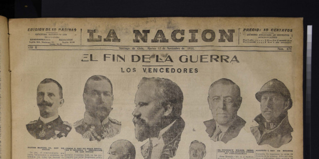 La Nación. Santiago : Talleres Gráficos. La Nación, 1917-2010, volumenes, año II, número 670, (12 noviembre 1918), páginas 1 y 3