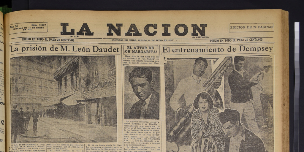 La Nación. Santiago : Talleres Gráficos. La Nación, 1917-2010, volumenes, año XI, número 3.842, (23 julio 1927)