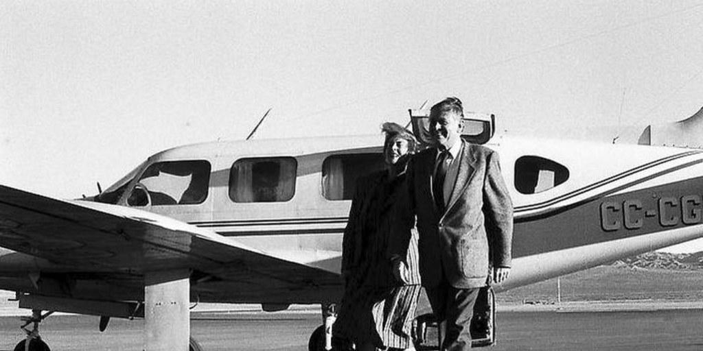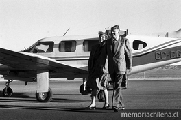Patricio Aylwin A. junto a su esposa Leonor Oyarzún, caminando por la pista de un aeropuerto, hacia 1989