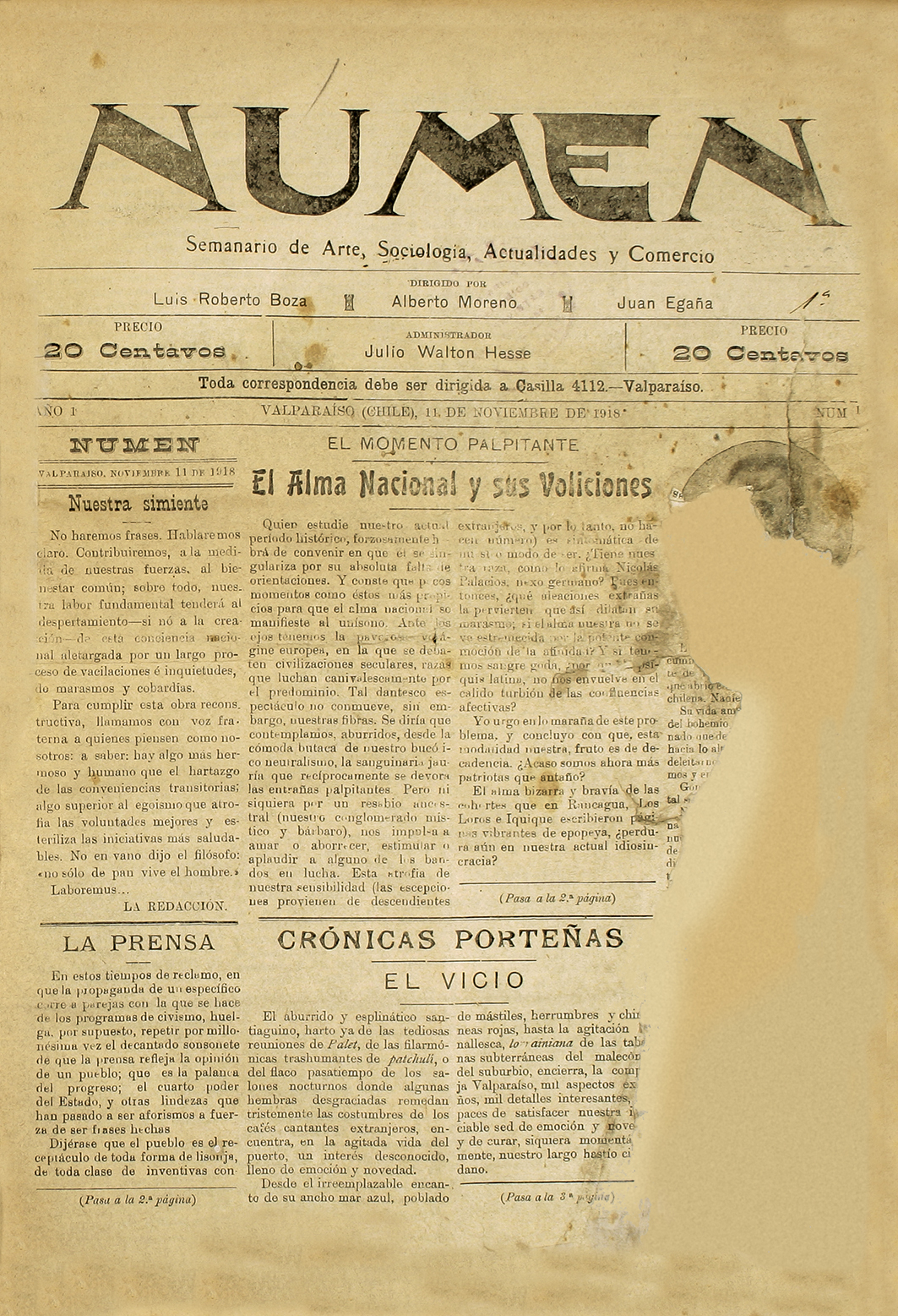 Numen. Santiago : L.R. Boza, A. Moreno, J. Egaña, 1918-1920, (Valparaíso : Talleres Numen), 1 volumenes, año I, número 1 (11 noviembre 1918)