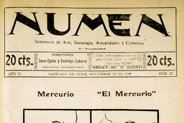 Numen. Santiago : L.R. Boza, A. Moreno, J. Egaña, 1918-1920, (Valparaíso : Talleres Numen), 1 volumen, año II, número 33, (29 noviembre 1919)