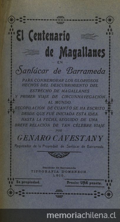 El centenario de Magallanes en Sanlúcar de Barrameda: para conmemorar los gloriosos hechos del descubrimiento de Estrecho de Magallanes y primer viaje de circunnavegación al mundo