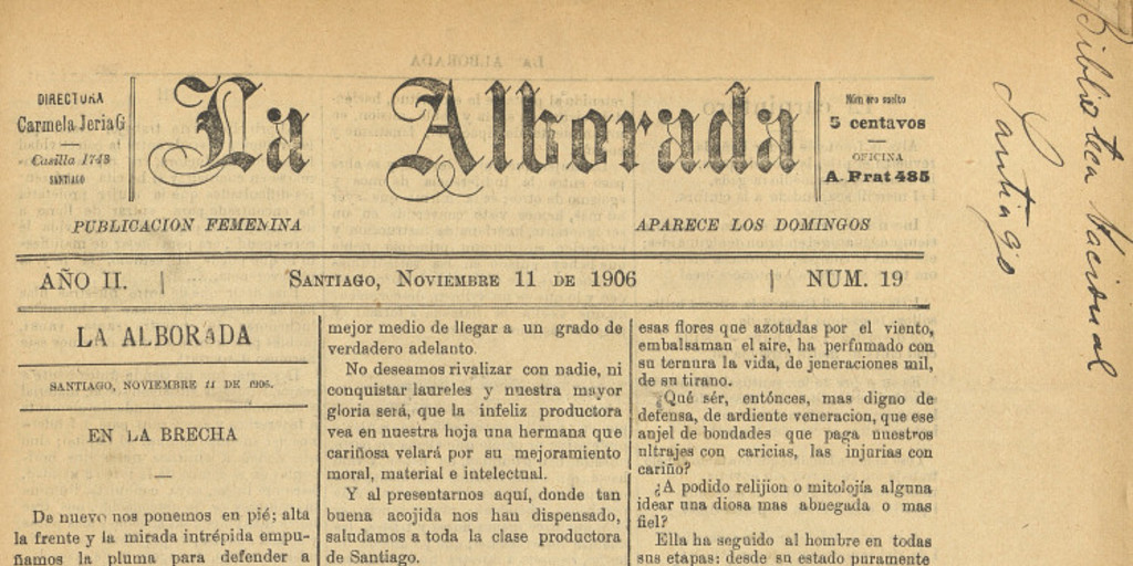 La Alborada. Valparaíso, Santiago : Impr. El Deber, 1905-1907. 42 números. Año II, número 19 (11 noviembre 1906), página 3