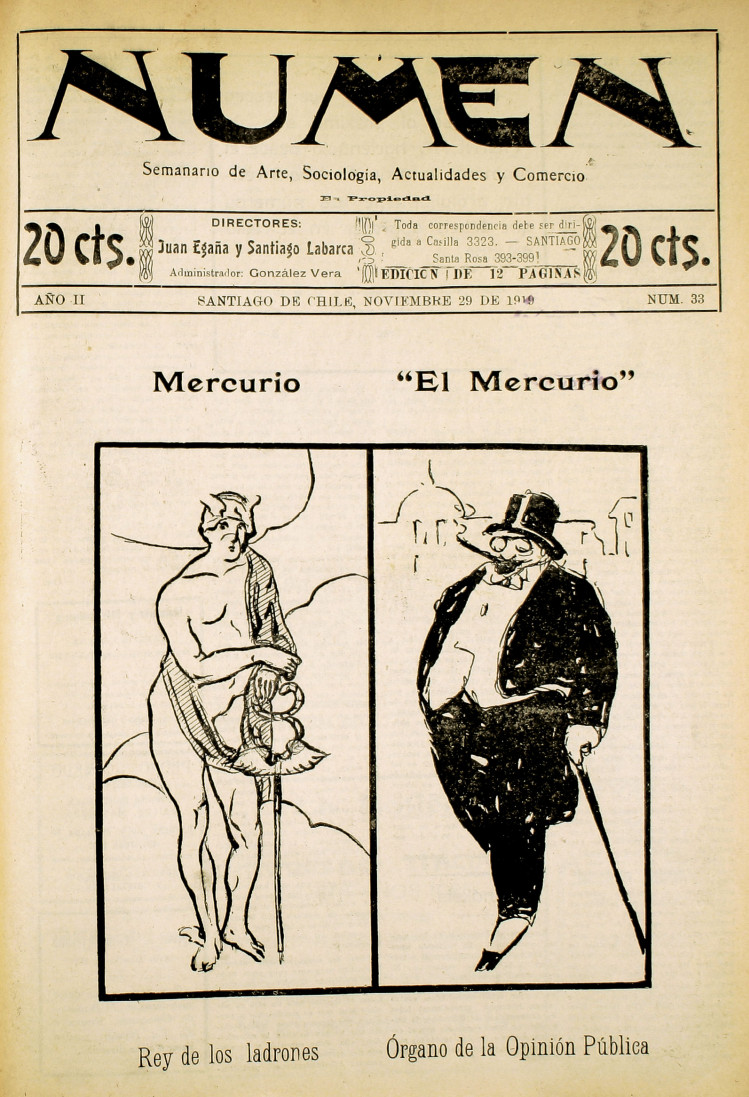Numen. Santiago : L.R. Boza, A. Moreno, J. Egaña, 1918-1920, (Valparaíso : Talleres Numen), 1 volumenes, Año 2, número 33, (6 diciembre 1919), páginas 8-9