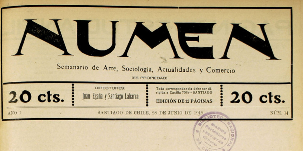 Numen. Santiago : L.R. Boza, A. Moreno, J. Egaña, 1918-1920, (Valparaíso : Talleres Numen), 1 volumenes, año I, número 14, (28 junio 1919)