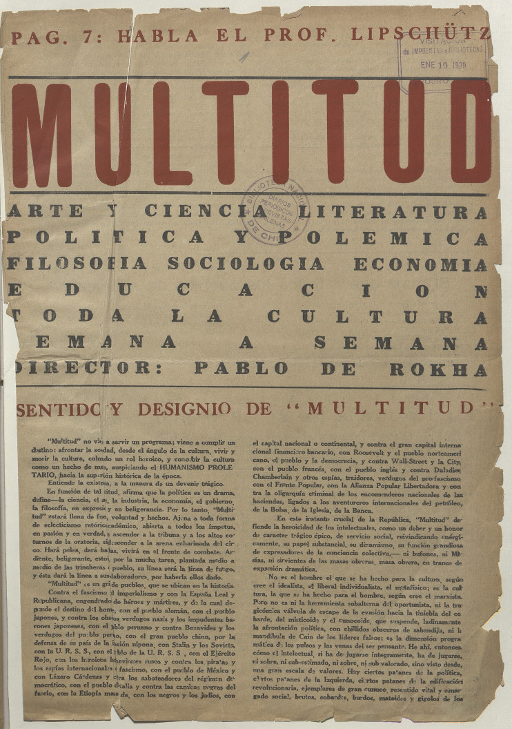 Multitud. Santiago : [Editor no identificado], 1939-1963. volúmenes, año I, número 1, (1era semana 1939), página 6
