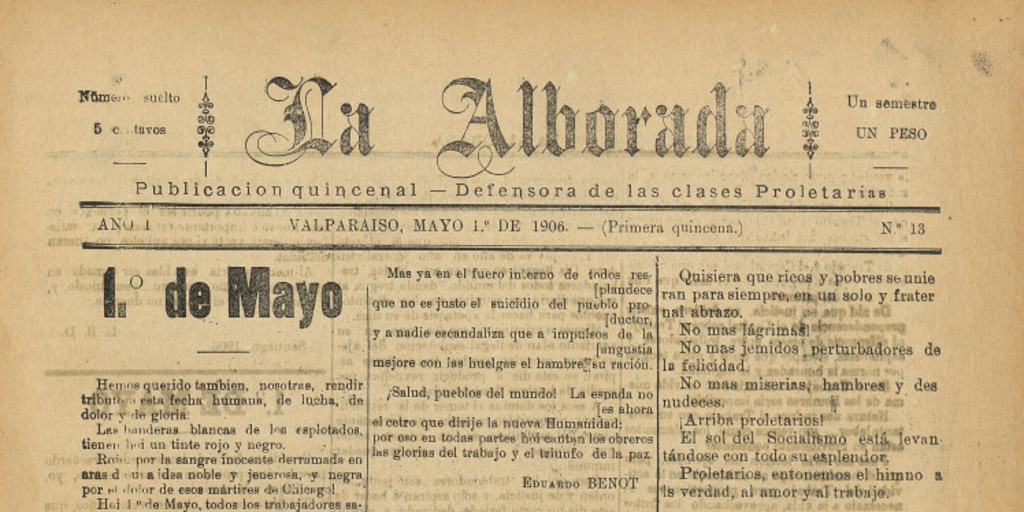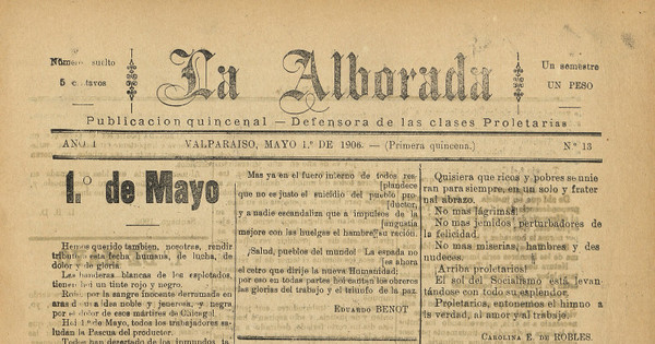 La Alborada. Valparaíso, Santiago: varias imprentas, 1905-1907, año I, número 13 (1 de mayo de 1906), páginas 2-3