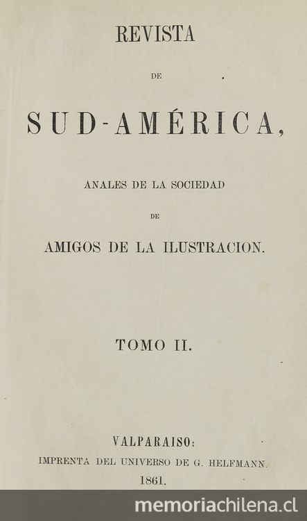 Revista de Sud-América / Anales de la Sociedad de Amigos de la Ilustración. Valparaíso : La Sociedad, 1860-1863 (Valparaíso : Universo) 2 volúmenes, tomo 2, año 1, número 1 (10 mayo 1861)-número 12, (10 octubre 1861)