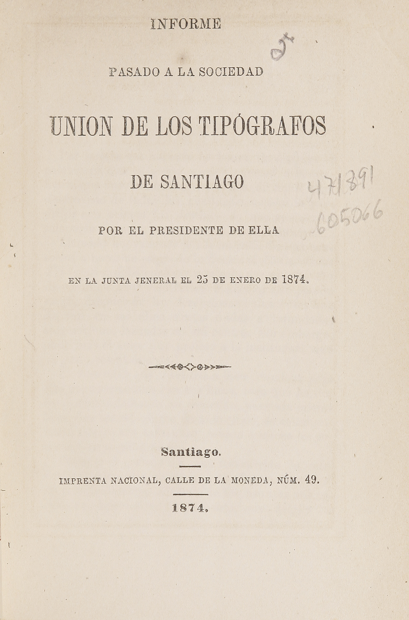 Informe pasado a la Sociedad Unión de los Tipográficos de Santiago por el presidente de ella en la junta general el 25 de enero de 1874