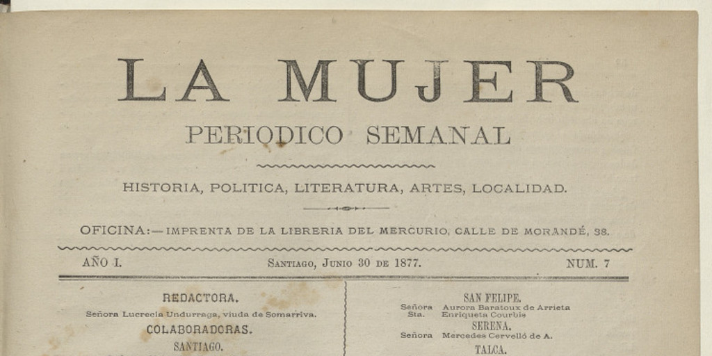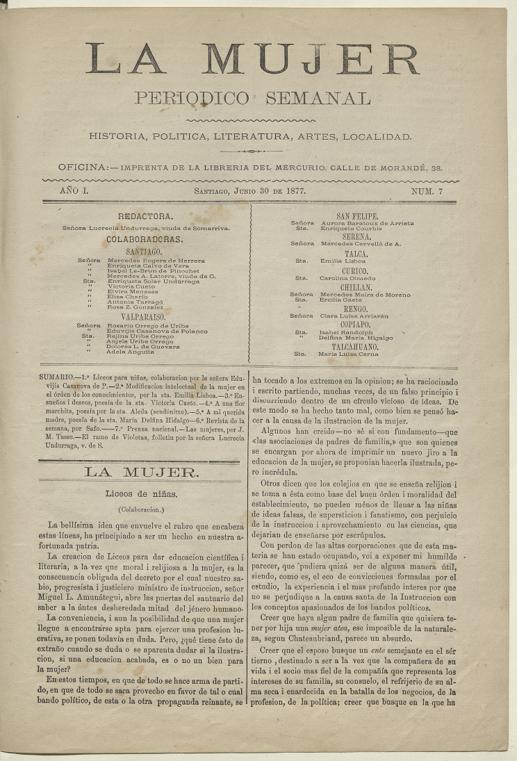 La Mujer. Santiago: redactado por Lucrecia Undurraga, viuda de Somarriva, 1877 (Santiago: Imprenta de la Librería del Mercurio), 1 volumen, año 1, número 7 (30 de junio de 1877), páginas 49-50