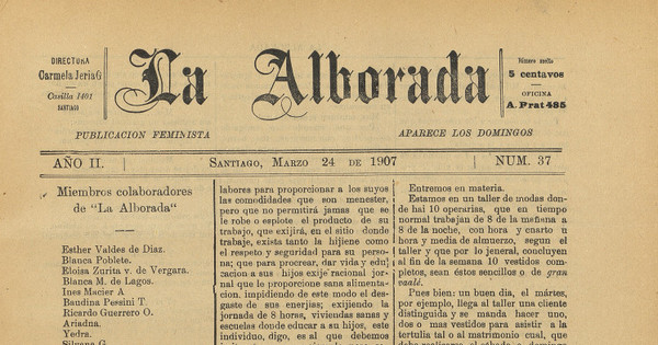 La Alborada. Valparaíso, Santiago: varias imprentas, 1905-1907, año II, número 37 (24 de marzo de 1907), página 1; número 38 (6 de abril de 1907), página 2; número 39 (14 de abril de 1907), página 1; número 40 (21 de abril de 1907), página 1; número 42 (19 de mayo de 1907), páginas 1-2